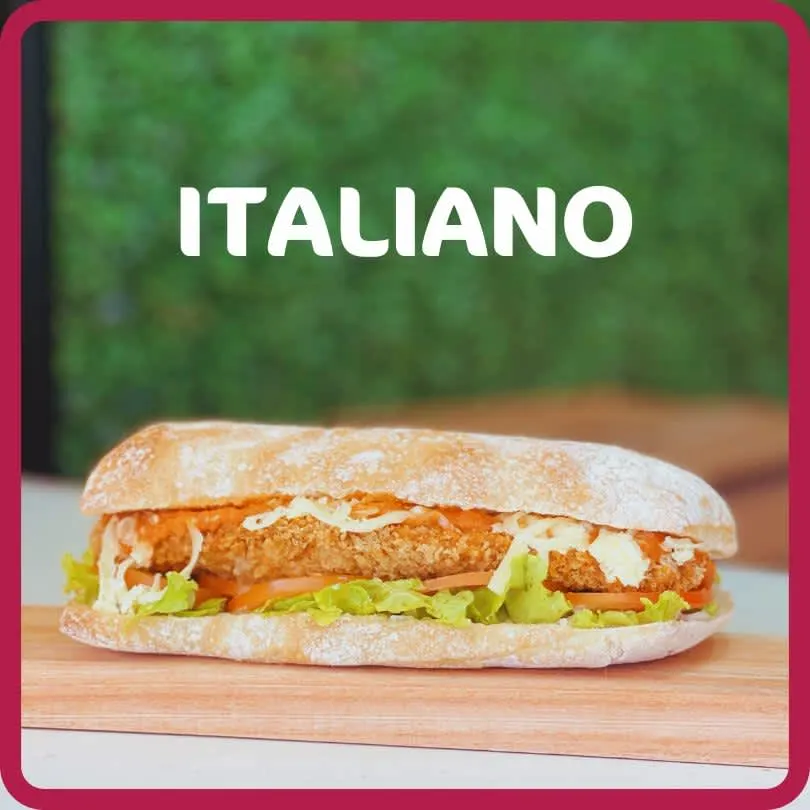 Pão ciabata, bife bovino a milanesa de 130g, molho de tomate italiano caseiro, queijo mussarela, tomate fresco e alface.